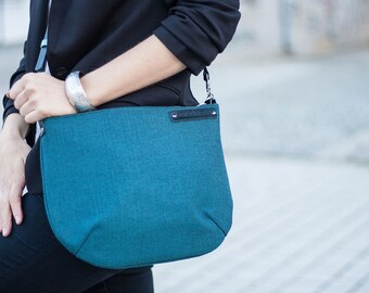 turquoise handbag, small crossbody bag, blue canvas bag, zippered bag, leather strap