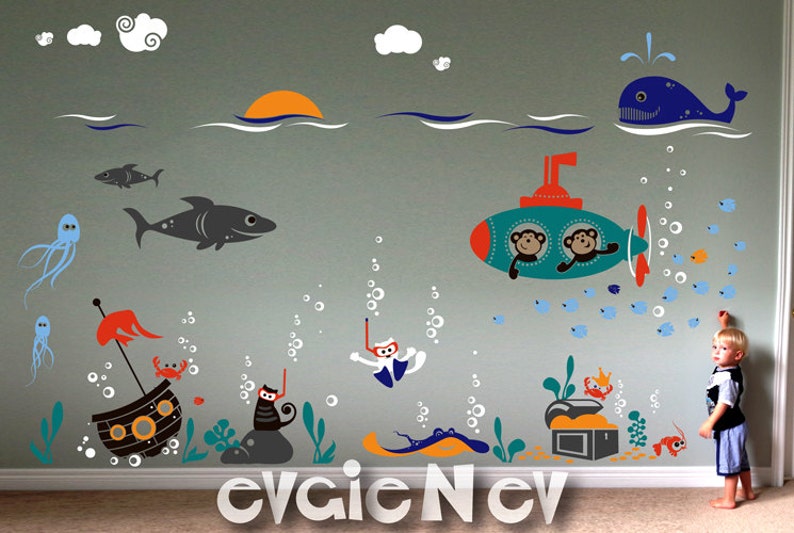 Submarine Wall Decal, Under the Sea Wall Decal, Monkey and Fishes Wall Decal, Ocean Wall Sticker, Sea Life Wall Decal, Aquarium Wall Decal