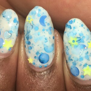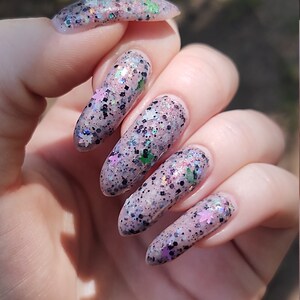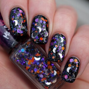 I love this! The moon glitters come out pretty easily, which is a relief. With the orange and purple pieces, I really do get into the Halloween spirit when I look at my nails.