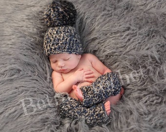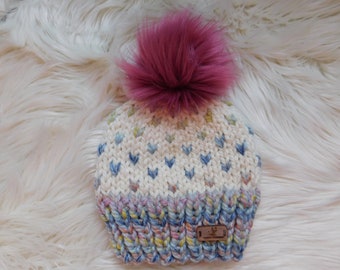 I have used a traditional textured stitch with a cable pattern for the jacket and trousers.. There are 7 darker mauve buttons on the front of the jacket to fasten. The trousers tie at the waist with a twisted cord which can be replaced with elastic if preferred. The pom pom hat has been knitted using 4 needles so there is no seam, and has a turn back brim for a snug fit.