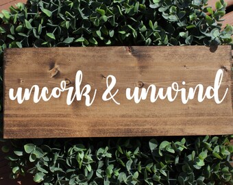 Uncork and unwind sign, drinking sign, housewarming gift , quote sign, wine sign, kitchen sign