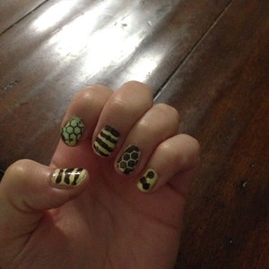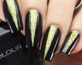 - Apply nail polish across the tape/stencil. Try to use fresh or thinned polishes as gloopy or thicker nail polishes won't work. Shimmery nail polishes work the best. For better results with stencils we try using a sponge to apply nail polish, similar to ombre design.