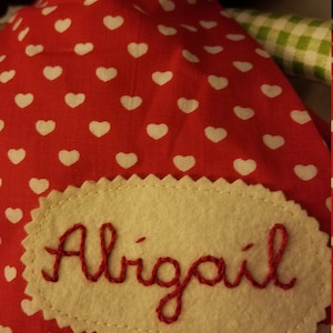 Name tags are hand embroidered on the cape, the back of the doll or on clothing.
