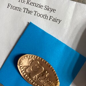 This copper tooth 'fairy' gift features the tooth fairy pressed onto a copper penny. Your child will be ecstatic to find this tooth fairy gift under their pillow.