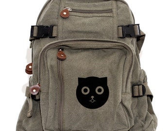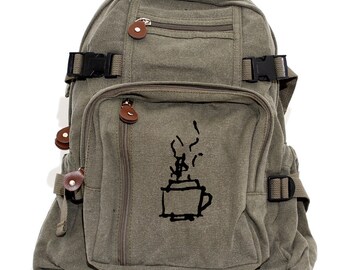 Hand-Flocked Backpack; Backpack Made of Lightweight Cotton Canvas; Backpack Color: Vintage Green; Backpack Size: 15"(h) x 13.5"(w) x 7"(d); Original Artwork.