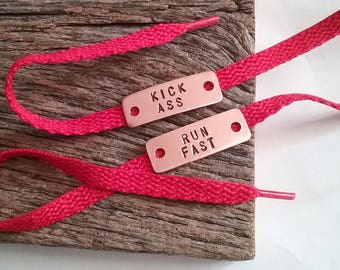 Run Fast Kick Ass Hand Stamped Athletic Shoe Tag Humor Jewelry Gift for Runner Gift for Boyfriend Gift for Son Funny for Him Workout Gift