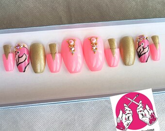 Flamingo Swarovski Hand Painted False Nails | Pink Gold | Summer | Little Nail Designs