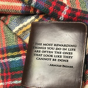 My husband LOVED this. I had this made for his birthday. He was once a golf pro and again chasing his dreams to get back into the game. He loves Arnold Palmer, so I had seen that saying and liked it engraved into the book, along with my husband’s initials inside. Its beautiful and my husband absolutely loved and appreciated it!!