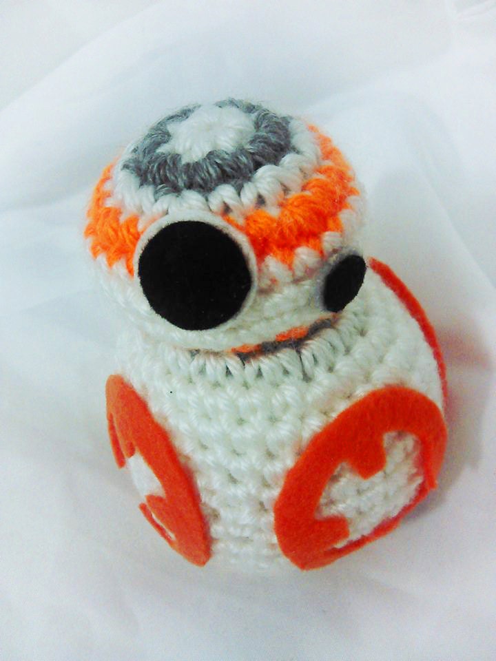 Made from Acrylic Yarn and Felt and stuffed with Polyester Fiberfill, this BB-8 plushie stands about 3.5 inches high and weighs about 2 ounces.