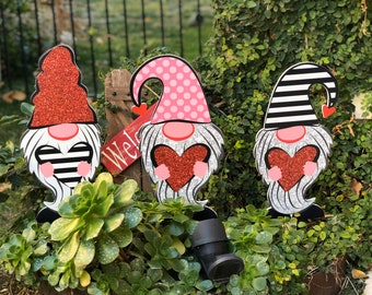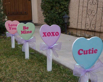 Valentine's Day Conversation Heart Yard Decorations! Comes with a set of 4 Conversation Hearts! Made on sealed PVC/vinyl and with a meshed bow. They measure 18 inches tall and the conversation hearts are 8 inches wide. Valentine's Day Conversation Heart Yard Decorations! Comes with a set of 4 Conversation Hearts or individuality. They measure 18 inches tall and the conversation hearts are 8 inches wide.