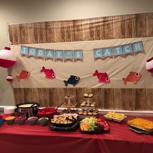 The set includes cupcake toppers, banner, food labels and tags, favor tags, water bottle labels, cake topper, fish garland/banner/bunting, a welcome sign, fishing signs, mini straw flags and 3D canoe snack holder.