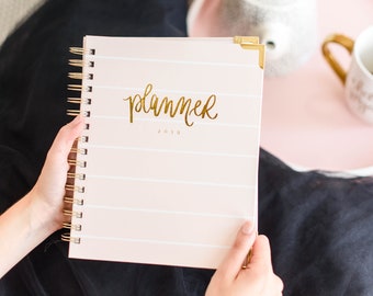 Daily Planner 2019 Pink and White Stripe Gold Planner | Organizer Boss Gift Weekly Planner 2019 Agenda Spiral Bound Planner Notebook