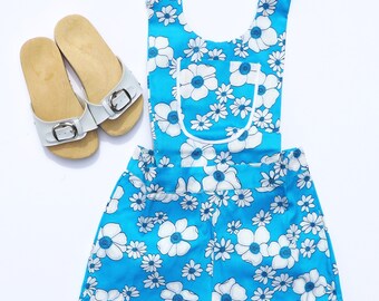 New Old Stock - Vintage 1960/70's - Girl's Retro Playsuit / Shorts / Summer Dungarees / Overalls - Floral Print - Turquoise - Age 6/7 & 7/8