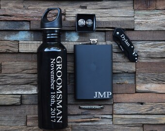 Groomsmen Gift Set, Personalized tie clip, Personalized, Cuff links, Personalized Water Bottle, Personalized Flask, Personalized Knife