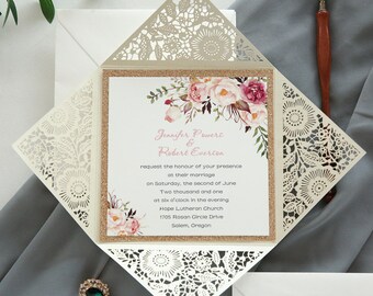 Floral wedding invitation pink wedding invitation, laser cut wedding invitation, fall wedding invitation, winter wedding invitation custom