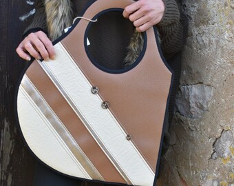 Handmade shoulder bag / Handbag / Synthetic leather purse / Brown, beije and gold/ Design by ME