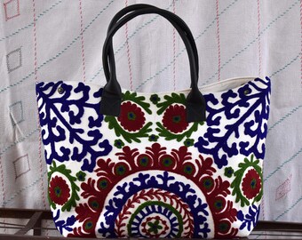 Handmade Wool Embroidered Indian tote bag / Tote bag / shoulder bag / leather handle bag