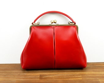 Leather Handbag "Olive" in red, vintage ladies bag, leather handle bag, leather bag, handmade!