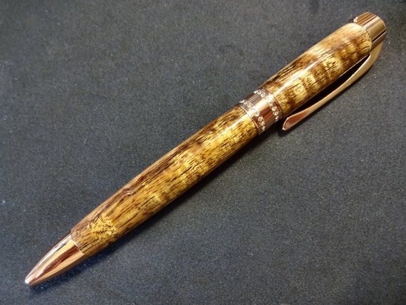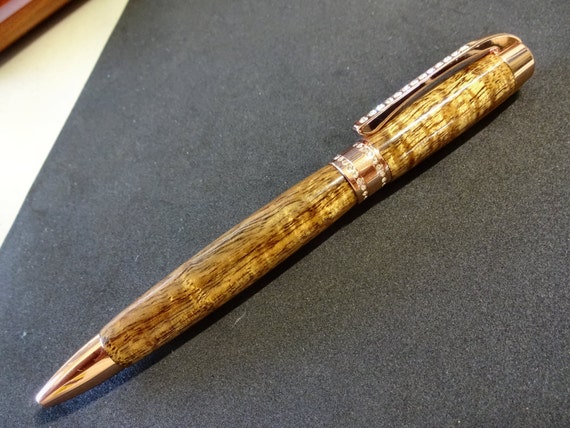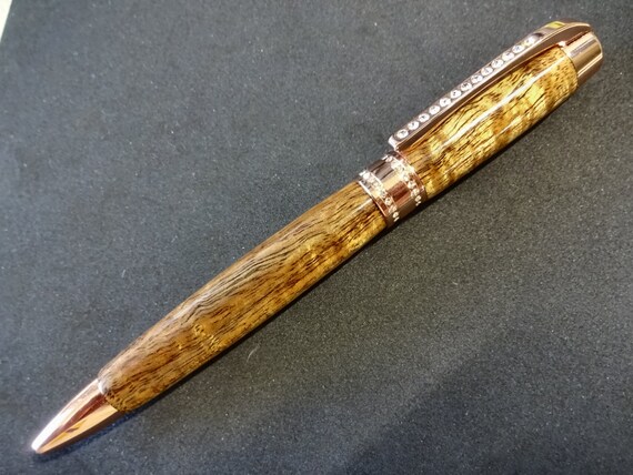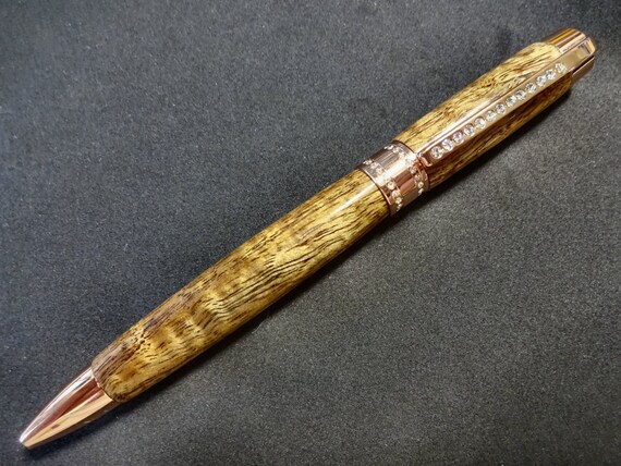 Hand turned Princess style rose gold twist ballpoint pen made from native Hawaiian curly Koa with waves of gold playing along its surface. The Princess style is elegant and graceful with 50 clear Swarovski crystals to add delicate sparkle to the clip and the band. Exceptional balance and comfort make this pen a joy to use and a great gift for any occasion. Top quality components throughout assure dependability & performance. My creations are heirloom quality unique one of a kind pieces of usable art, no two are exactly alike.