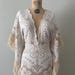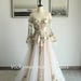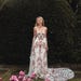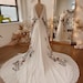 Crafted with intricate wildflower lace, this dress features long cape sleeves and a daring plunge neckline, combining elegance with a touch of bohemian flair. The flowy chiffon fabric adds an ethereal quality, allowing you to move gracefully and effortlessly. The delicate lace detailing and flowing silhouette create a look that is both romantic and whimsical, ideal for the bride who wants to feel like a woodland fairy on her special day.