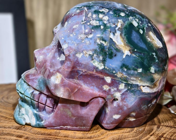 Ocean Jasper Skull Sculpture: Metaphysical Crystal Carving, Home Decor