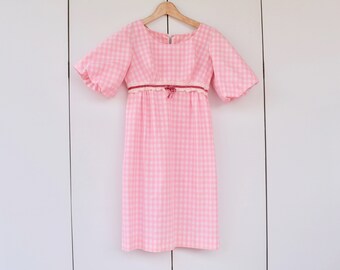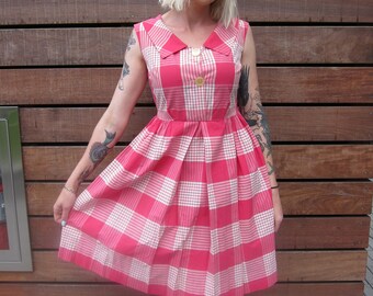 Adorable pink and white 60's gingham summer picnic dress with oversized buttons and full skirt M