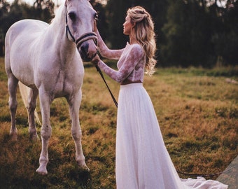 Bridal Boho Lace Dress, Long White or Ivory Chiffon Wedding Skirt, Ivory Engagement Prom Dresses Plus Size, Bridal Separates
