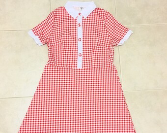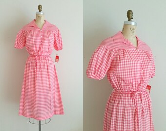 Vintage 1960s Red and White Gingham Dress / Cotton Day Dress / Picnic Dress / Small Medium / Tags Attached