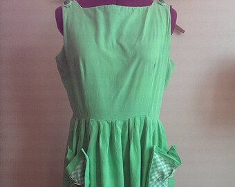 SALE 1950s 60s Bright Apple Green Cotton Picnic Dress with Large Pockets