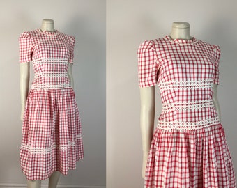 50s Picnic Dress in Red & White Gingham Plaid- 1950s Puffy Sleeves Rockabilly Drop Waist Checked Back Buttons Cotton Rick Rack Extra Small