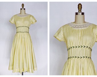 Daisy Chain Picnic Dress | vintage 1950s yellow fit and flare dress