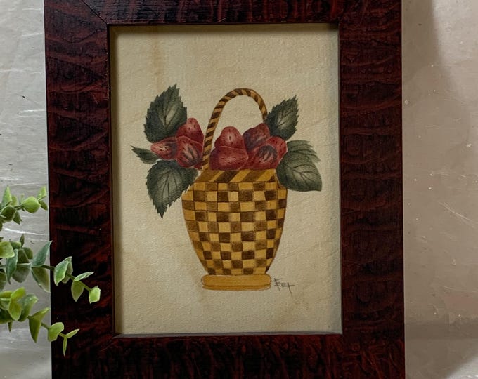Ann Rhea Theorem Painting Basket of Strawberries - Vintage Folk Art Theorem Painting