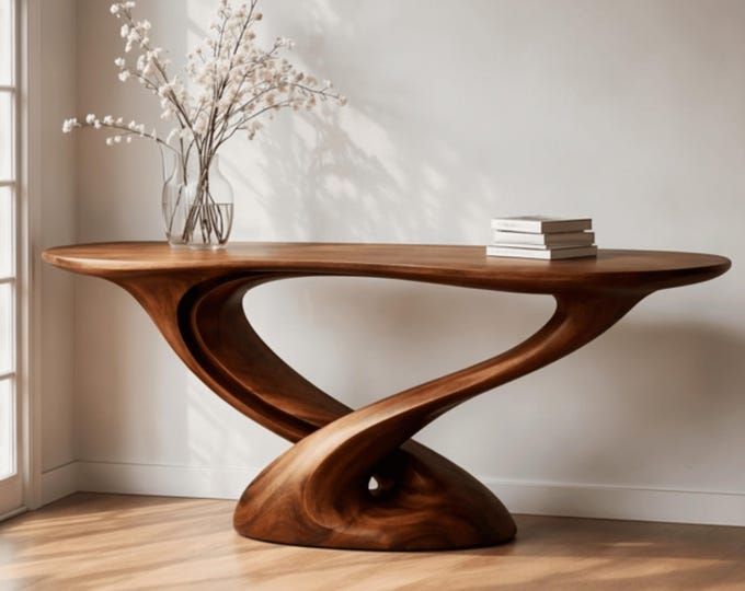 Massief notenhouten consoletafel, op maat gemaakte sculpturale houten haltafel, Japandi Hall-tafel, moderne banktafel