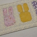 This colorful Easter runner is sure to please all. It has two patchwork bunnies on either end of the runner that have been made by sewing numerous Easter fabrics together and then appliqued with a zig zag stitch to the background fabric. Its borders have also been made from a variety of Easter themed fabrics to continue with the patchwork effect of the bunnies. The fabrics chosen depict images of Easter eggs, bunnies, carrots, flowers, polka dots and so much more. It has been bound by a purple mini polka dot fabric, and the reverse side is solid white. It measures 13 3/4 inches wide by 37 1/4 inches long.