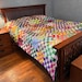 Ręcznie wykonana, ręcznie wykonana, 100% bawełniana kołdra patchworkowa. Kwadrat o boku 62 cali (158 cm). Różnej wielkości bloki w odcieniach niebieskiego na białym tle, oddzielone granatowymi paskami.