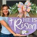 Celebrate the true meaning of Easter with this vibrant Christ the Lord Is Risen Today wreath! This handcrafted wreath features beautiful layers of purple, mint green, and soft pink ribbons surrounding a faith-filled centerpiece that boldly proclaims the resurrection message.