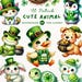 Cute Animals: Woodland creatures (bear cub, fox, bunny, puppy) wearing green hats.