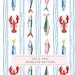 Lemons, lobster, crab, seashell, sea turtle, whale tail, ocean waves, tropical flower, glass bottle