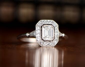 Asscher Cut Diamond Ring 0.50 Carats - Sapphire and Diamond Halo Platinum Ring