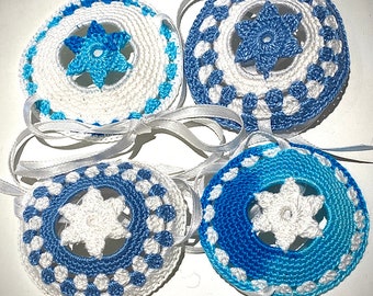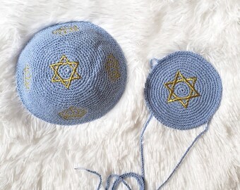 Here is a yarmulka kippah in a pastel rainbow unicorn theme. These are hand crocheted of 100% cotton thread. They have a center star of David and rainbow colored stripes. They are about 6 inches in diameter but can be made in any size. The baby's can soft ribbons for a loose under the chin tie. They can also be personalized and sold separately or as father son sets. These can be designed and created in all colors, sizes and themes and I welcome all ideas for your custom kippah. Thanks so much for stopping by!