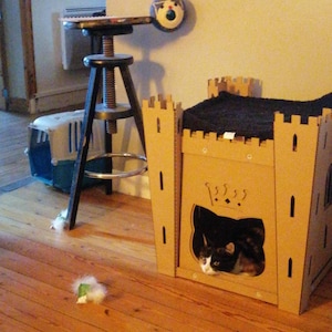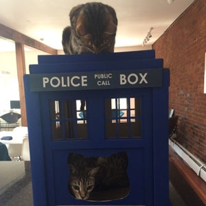 My two cats love their Dr. Who Tardis. I put a blanket on top because they fall asleep on top everyday. Unwrapped and put together fast. Then, Bob's your uncle! It is ready to enjoy. Front door trimmed a bit for large 17 lbs. male cat to enter Time & Relative Dimension in Space.