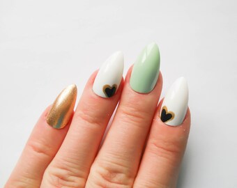 Mint Green and Gold Heart Nails, Stiletto Nails, Almond Nails, Fake Nails, Press On, Nails