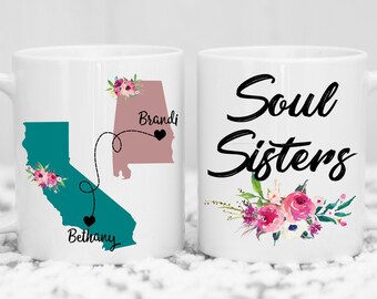 Long Distance Mug, Soul Sisters, State to State Mug, Personalized Long Distance Mug, Going Away Gift, Long Distance Mug Friend