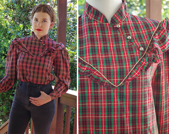 VICTORIAN Revival 1970's 80's Vintage Red Green + Black Plaid High Collared Blouse w/ Ruffled Edges // size Small Med