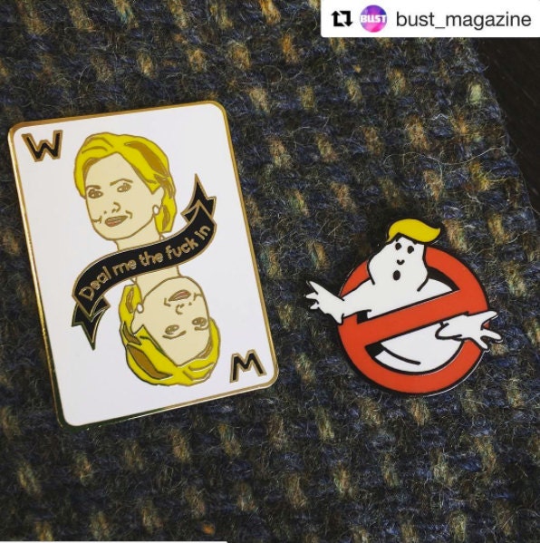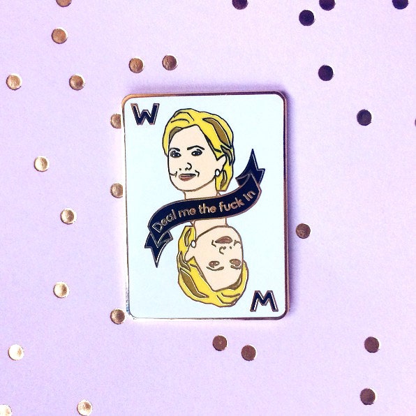 Made of high-quality hard enamel with gold detailing, she stands 1.5" tall with two rubber clutches to keep her extra secure. Comes on a sleek white backing card with gold detailing - great for a gift!