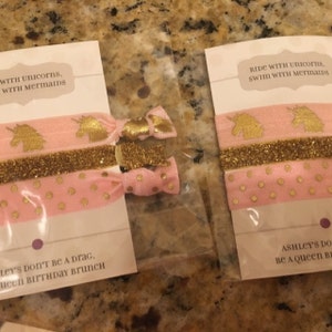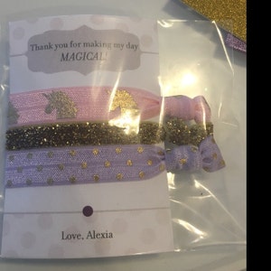 If you're throwing a party with a theme that doesn’t quite fit with unicorn hair ties, we can create a custom hair tie favor with her favorite colors/theme instead. Send us a message prior to purchase to discuss available hair ties to create your girls’ perfect birthday party. Each of these birthday party favors will come packaged in a clear cello envelope.