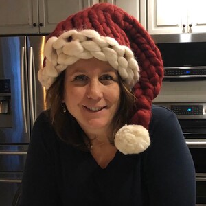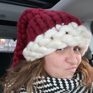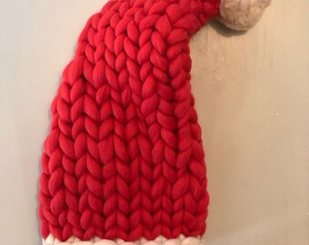 Hand knitted in chunky red and white merino yarn, this Christmas hat is so much fun and sure to make a statement and can be brought out every year!
