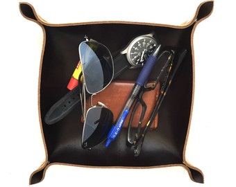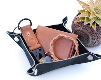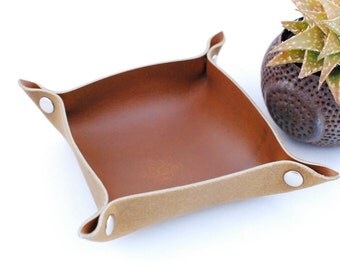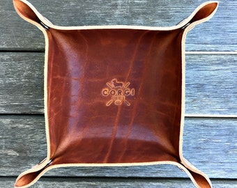 This is a travel style Valet Tray that unsnaps at the corners for flat storing and is perfect for travel. The Horween Rust colored Dublin style leather is tanned in the USA and will age beautifully. Like all Corgi Leather Co products, this Valet Tray is guaranteed for life.