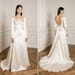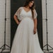 This unique lace wedding dress features a stretch lace bodice with a deep v-neck, double spaghetti straps and a slightly dropped back. The full ivory satin skirt features a cream mesh and tulle overlay and a chapel length train (about 3 feet). It is available with or with out the lace kimono topper and only comes in ivory. It is shown with a satin bow belt that comes complimentary upon request.