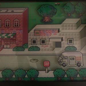 By popular demand I humbly present a scene from the beautiful town of Onett in EarthBound! I had a hard time choosing a scene because there were so many nice places in EarthBound, but the drugstore and burger shop won me over with their simple charms and bright colors.